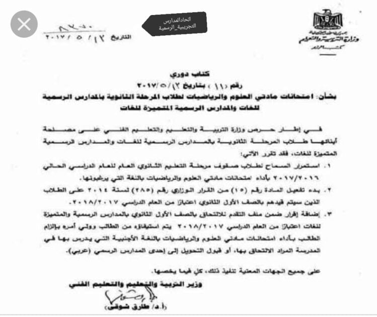 ناشد أولياء أمور طلبة الثانويه العامة  بمدارس اللغات الدكتور طارق شوقي وزير التربيه والتعليم بالسماح بالتعريب للطلبه دفعة 2019/2020 لكونهم ما زالوا يعانون من عدم توفر معلمين كفء