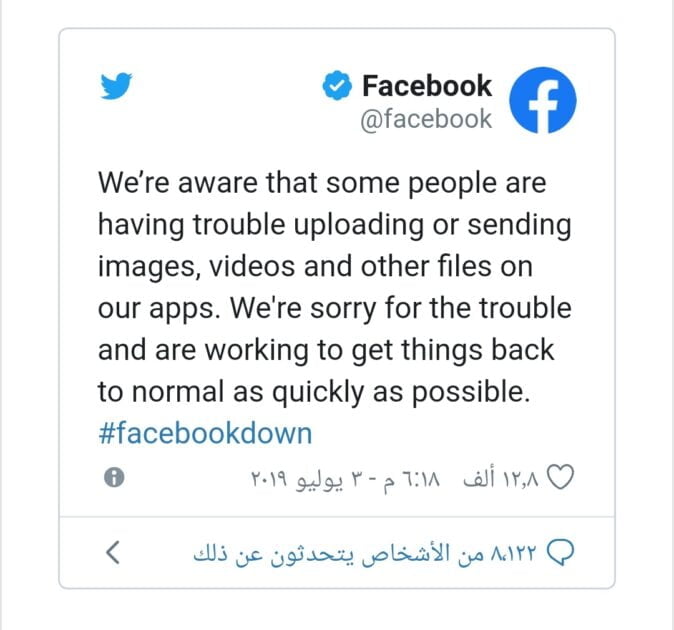 We’re aware that some people are having trouble uploading or sending images, videos and other files on our apps. We’re sorry for the trouble and are working to get things back to normal as quickly as possible. #facebookdown
