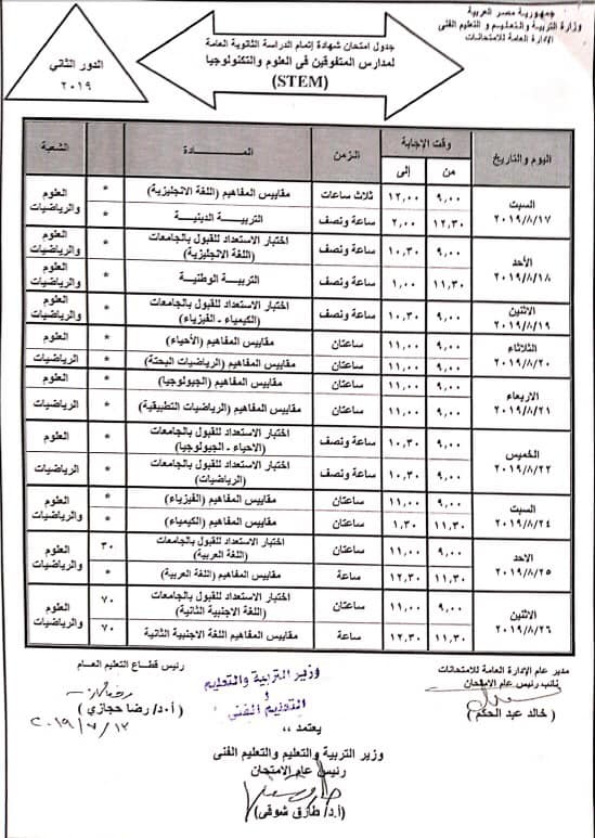 كما اعتمد الوزير، جدول امتحانات الدور الثاني لشهادة إتمام الدراسة الثانوية العامة لمدارس المتفوقين في العلوم والتكنولوجيا (STEM)، وجدول امتحانات الدور الثاني لشهادة إتمام الدراسة الثانوية العامة للمكفوفين.