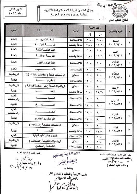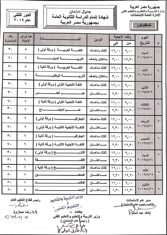 اعتمد الدكتور طارق شوقي وزير التربية والتعليم، جدول امتحانات الدور الثاني لشهادة إتمام الدراسة الثانوية العامة للعام الدراسي 2018 /2019.