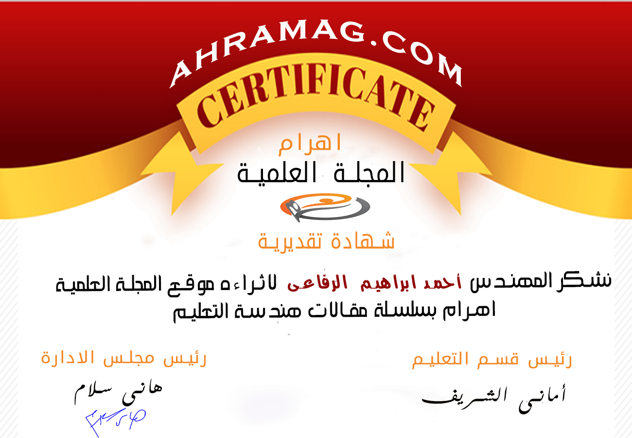 شهاده تقدير مقدمة للمهندس أحمد إبراهيم الرفاعي لإثراءه المجلة بسلسلة مقالات هندسة التعليم
