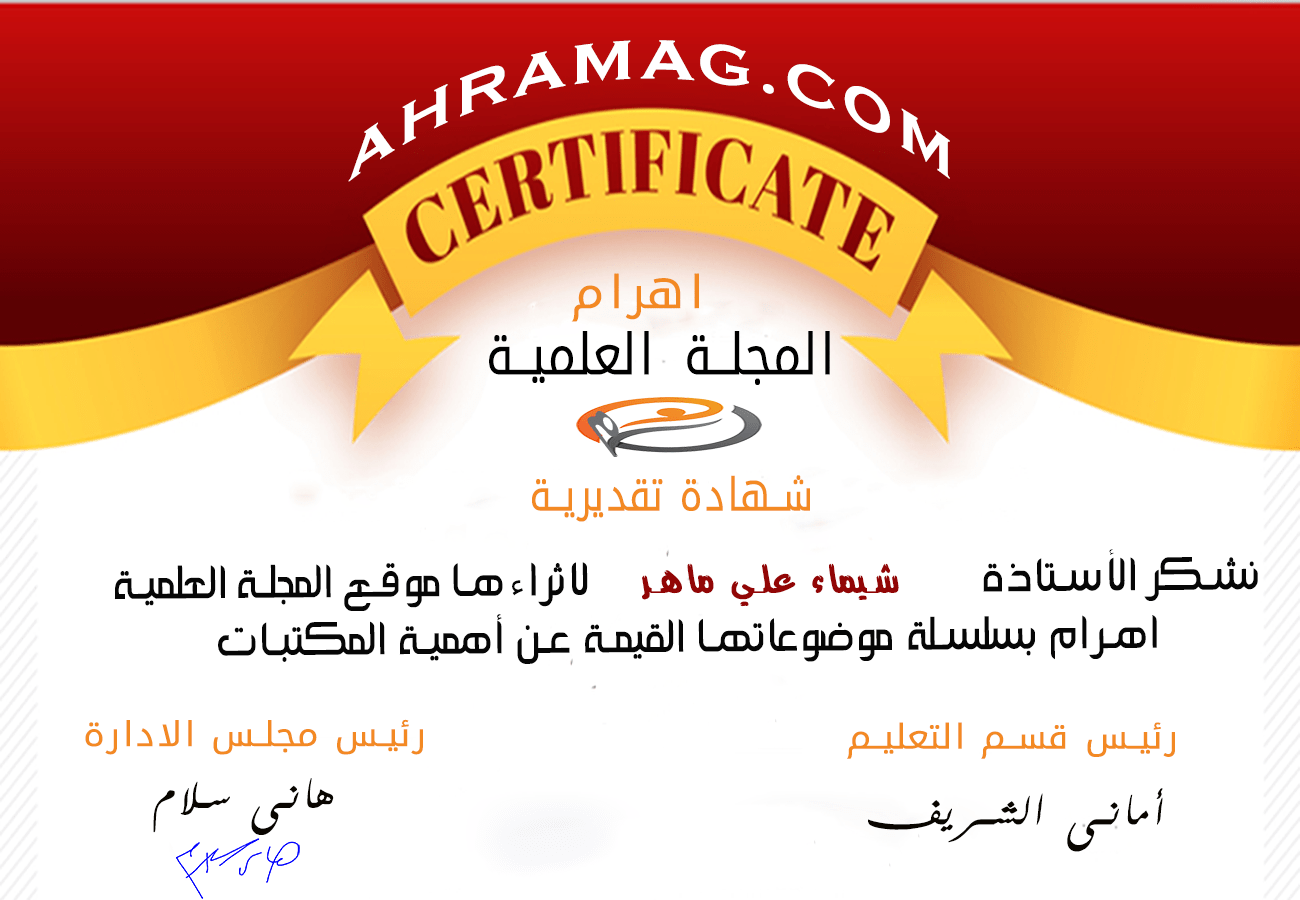 شهادة تقدير مقدمة للأستاذة شيماء علي ماهر لإثراءها المجلة بسلسلة موضوعاتها القيمة عن أهمية المكتبات