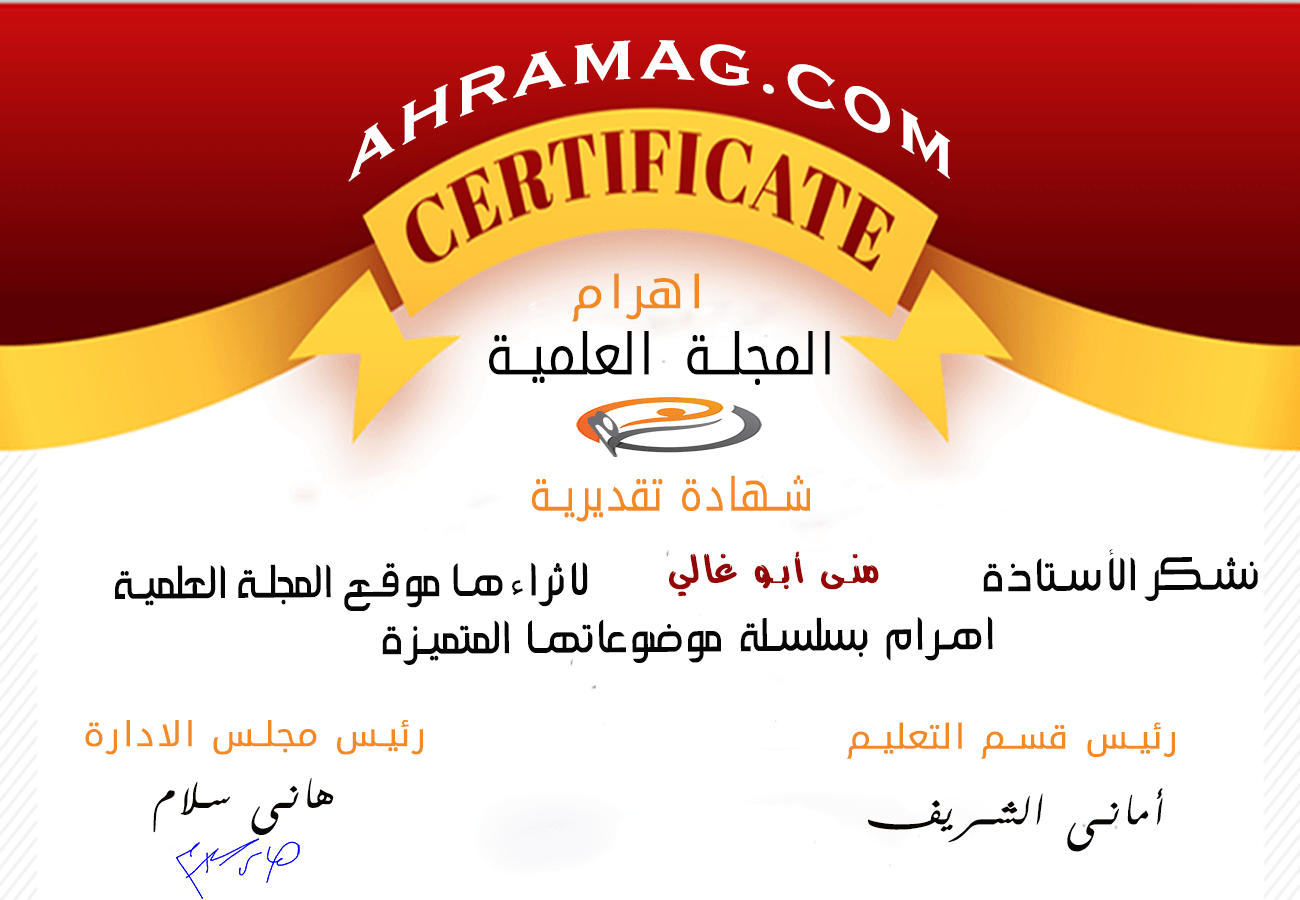 شهادة تقدير مقدمة للأستاذة منى أبو غالي لموضوعاتها المتميزة