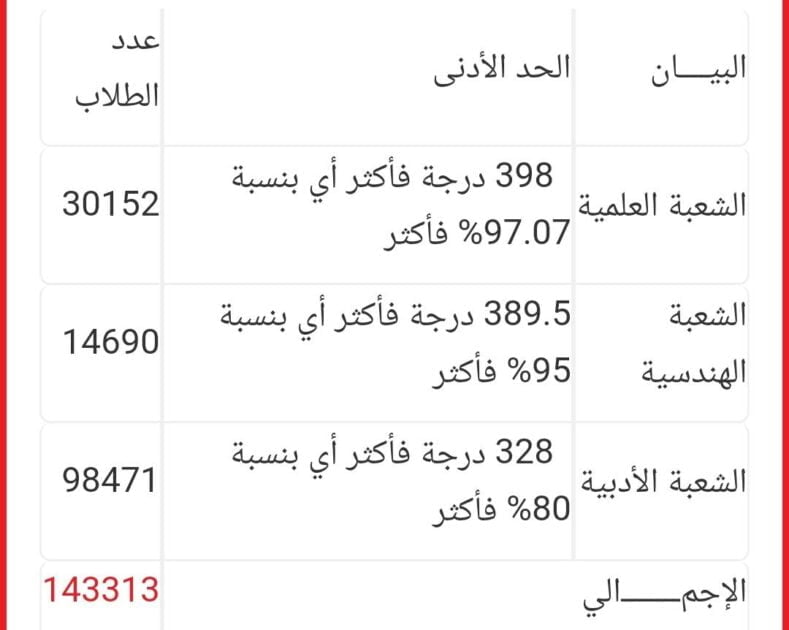 أعلنت وزارة التعليم العالى والبحث العلمى، فتح باب تسجيل الرغبات للمرحلة الأولى من التنسيق اعتباراً من يوم الأحد الموافق21/7/2019 حتى يوم الخميس الموافق 25/7/2019 وفقا للحد الأدنى التالى:-