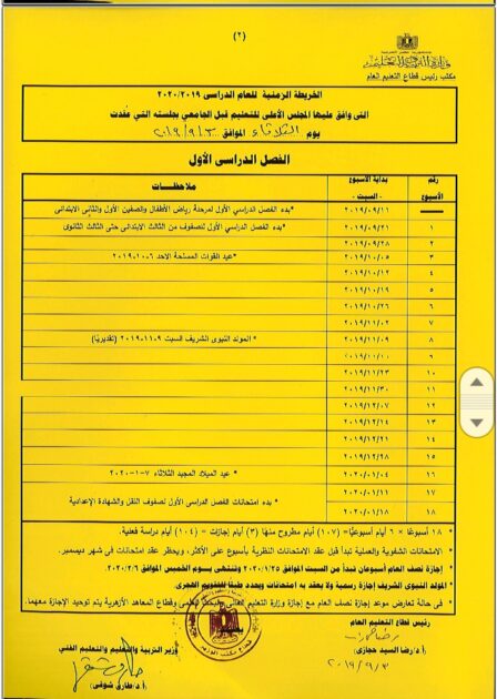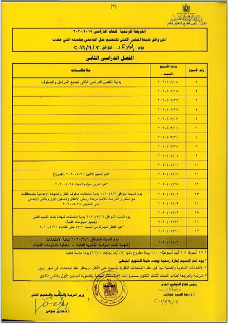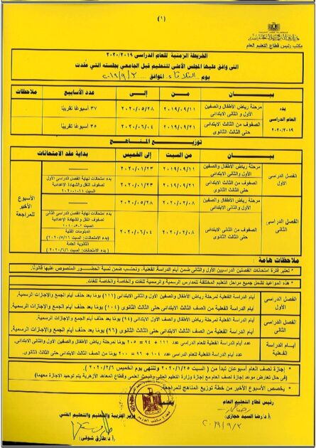 وأستعرض الدكتور رضا حجازى رئيس قطاع التعليم العام الخريطة الزمنية للعام الدراسي 2020/2019، وقد وافق المجلس عليها حيث تبدأ مرحلة رياض الأطفال والصفين الابتدائي الأول والثاني من يوم 11/9/2019 إلى يوم 28/5/2020، أما الصفوف من الثالث الابتدائي حتى الثانوي الثالث تبدأ من 21/9/2019 حتى 4/6/2020، ويتخللها إجازة نصف العام أسبوعان تبدأ من (السبت 25/1/2020 وتنتهى يوم الخميس 6/2/2020). أما الفصل الدراسي الثاني لمرحلة رياض الأطفال والصفين الابتدائي الثاني والأول وتبدأ من 8/2/2020 إلى 28/5/2020، والصفوف من الثالث الابتدائي حتى الثالث الثانوي تبدأ من2020 8/2/2020 إلى 4/6/2020. وفى أثناء الإجتماع تم مناقشة المشاريع المقترحة للتصويت؛ وقد وافق المجلس الأعلى للتعليم قبل الجامعي على مشروع القرار الوزاري المنظم للدارسة والامتحانات للصفين الأول والثاني الثانوي العام والتي تضمنت منطلقات استصدار القرار: • إعادة تحديد الفترات الزمنية لتدريس المواد الدراسية والأنشطة التربوية، بما يتناسب مع فلسفة التطوير.