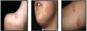 الفطريات هي كائنات دقيقة تسبب عدوى جلدية تتميز ببقع محمرة أو مائلة للبني على الجلد حيث تكون أقل تلوناً في المركز مما يعطي شكل الخاتم . يمكن لهذه البقع أن تتواجد في أي مكان في الجسم – معدية نجدها قد تنتقل من الحيوانات منها إلى الإنسان – و لكن من حسن الحظ كونها قابلة للعلاج و ليست من الإمراض التي تهدد الحياة .