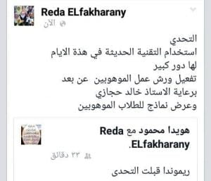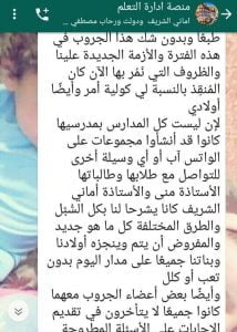 فقد كتبت الأستاذة رضا الفخراني رسالة قصيرة ولكنها تحمل كثير من المعاني مضمونها أن الموهوبين تعمل معًا تحت كل الظروف حتى لو بعدت بينهم المسافات فهي مستمرة في العطاء من خلال توجيه الطلاب وإرشادهم ودعمهم في عمل الأبحاث والتعريف بفيروس كورونا والاعلان عن ورش عمل أون لاين ومسابقات مختلفة سواء تابعة لإدارة الموهوبين أو المركز القومي للطفولة .