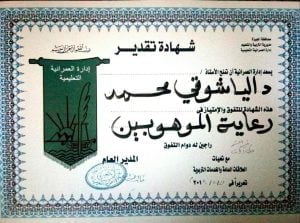 بالمركز الثالث على مستوى المديرية لتصميم شعار منتدى شباب العالم وحصلت على شهادة تقدير وامتحان مجانى تابع لشركة مايكروسوفت لمدة عام