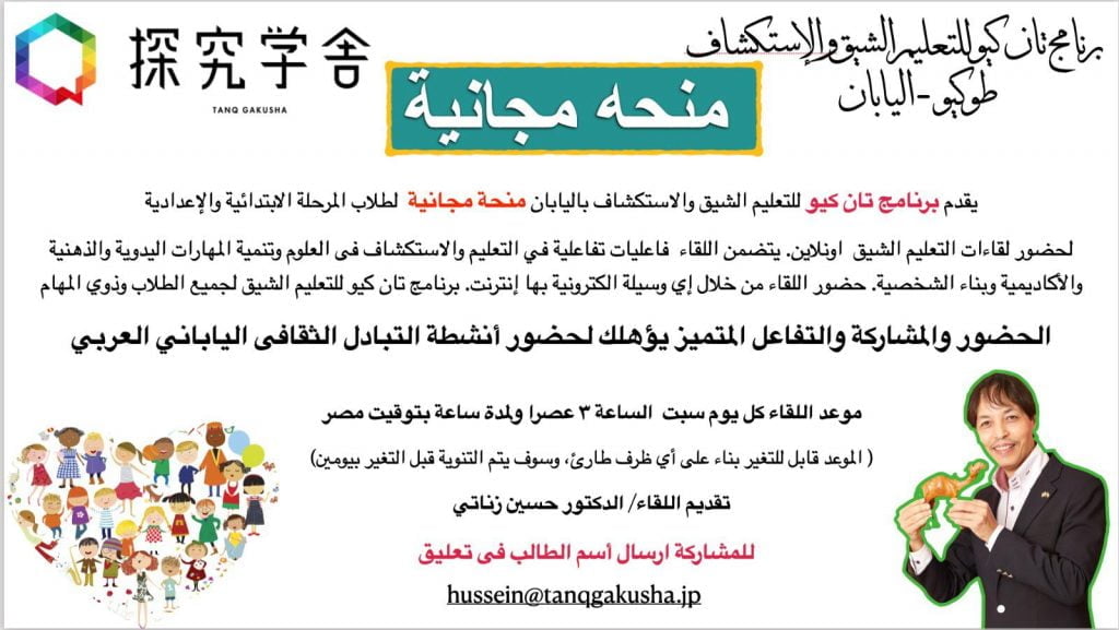 المنحة مجانية “أونلاين” لطلاب المرحلة الابتدائية والإعدادية في التعليم الشيق في العلوم من خلال الاستكشاف وتنمية القدرات البدنية والذهنية والأكاديمية وبناء الشخصية تحت رعاية مؤسسة تان كيو TanQ Gakusha للتعليم والاستكشاف باليابان.