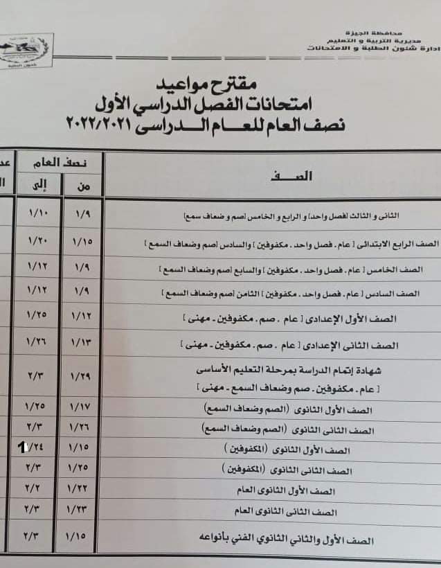 والأستاذ مجدى الجيار مدير مديرية التربية والتعليم بالجيزة مواعيد امتحانات الفصل الدراسى الأول ” نصف العام ” للعام الدراسى 2022/2021 مع اتخاذ كافة الاحترازية والوقائية والتباعد بين الطلاب واتداء الكمامة .