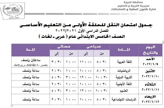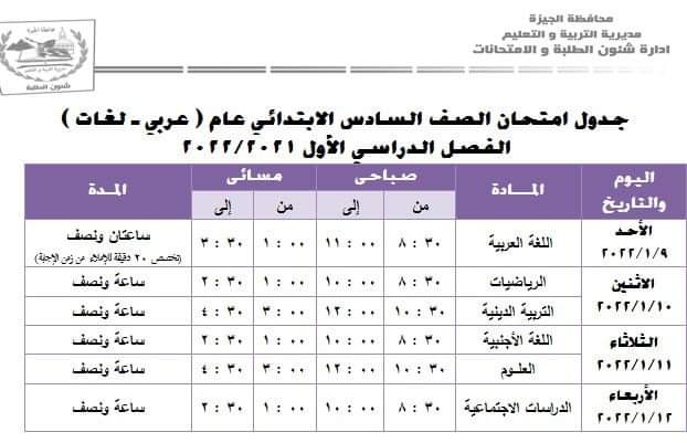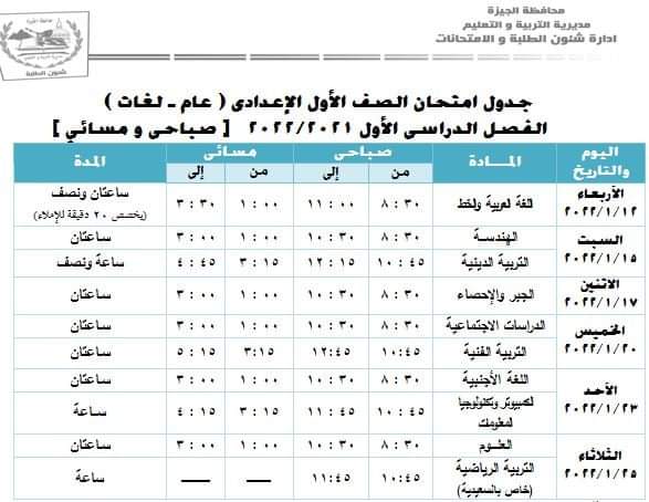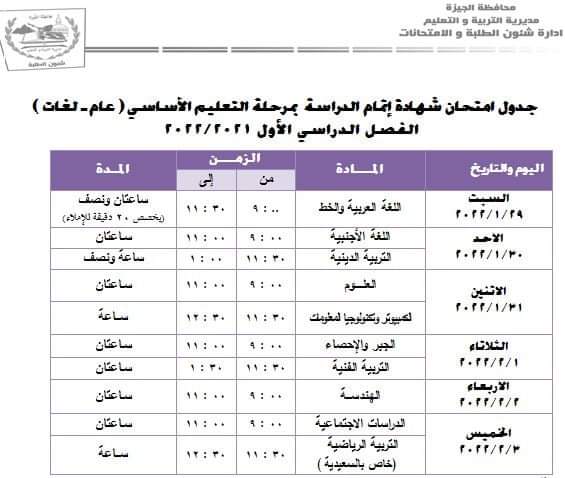 الجدول النهائي لامتحانات الفصل الدراسى الأول لمحافظة الجيزة