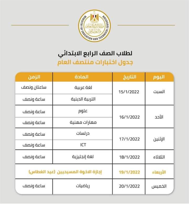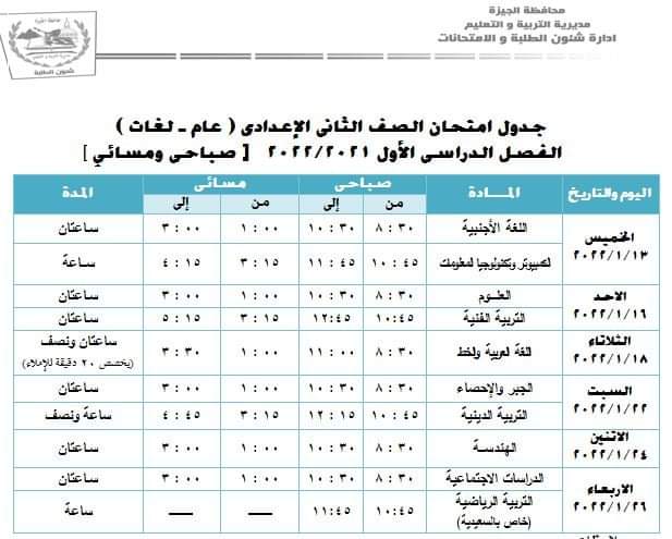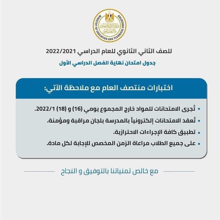( الصف الثانى الإعدادى ) “العام والمهنى والصم والمكفوفين ” يبدء خلال الفترة من 13 إلى 26 يناير 2022