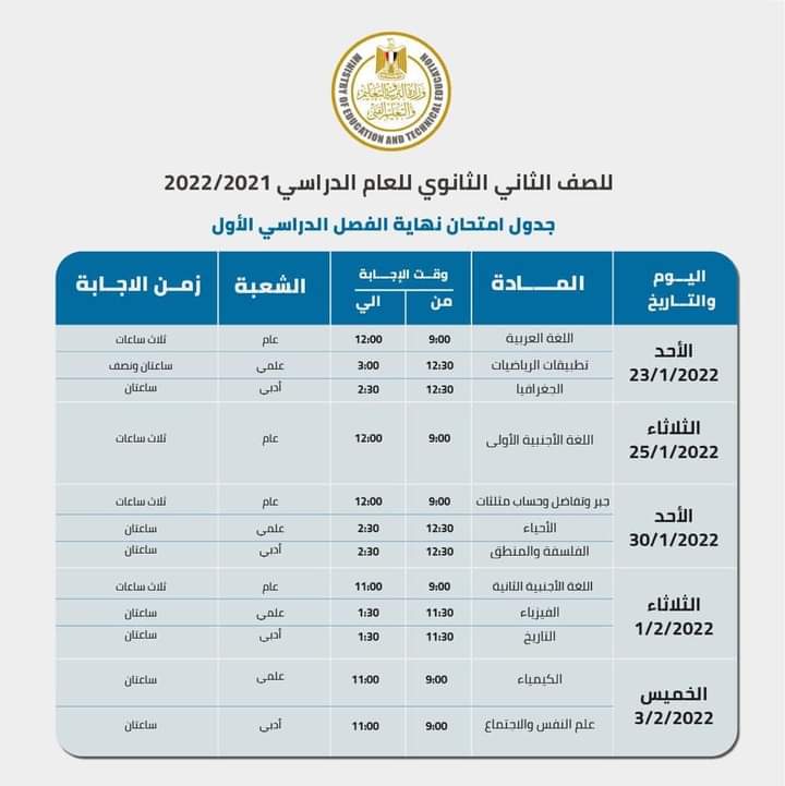 الصف الثانى الثانوى العام خلال الفترة من 23 يناير إلى 3 فبراير 2022