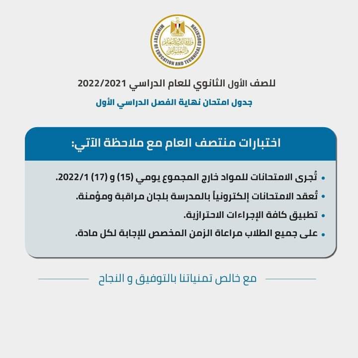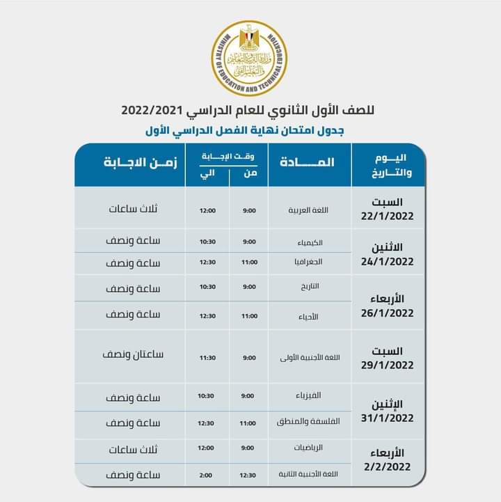 الصف الأول الثانوى العام خلال الفترة من 22 يناير إلى 2 فبراير 2022