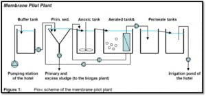 تم إنشاء الوحدة التجريبية (MPP) membrane pilot plant في حاوية شحن في ألمانيا وتم نقله إلى تركيا. أجريت العملية خلال تلاث شهور الصيف. تم ضخ جزء من مياه الصرف الصحي المنتجة في الفندق (7-10 م 3 / يوم) في MPP. تتكون عملية معالجة مياه الصرف الصحي من ترسيب أولي ، خطوة الحمأة النشطة منخفضة التحميل المصممة لإزالة النيتروجين والمواد الكربونية والترشيح الغشائي (الشكل 1). بالنسبة للترشيح الغشائي ، تم تنفيذ 6 وحدات MEMOS Pulse الأنبوبية بحجم مسام يبلغ 0.2 ميكرومتر و 40 مترًا مربعًا من مساحة السطح لكل وحدة. في الموسم الثاني تم إضافة غربال قبل الترسيب الأولي حيث ظهرت مواد صلبة خشنة كبيرة في خط سريان المياه لتكون أعلى بكثير من قيم التصميم. تم ضخ الحمأة الزائدة من الخزان الهوائي أولاً في خزان الترسيب الأولي ثم إزالتها مع الحمأة الأولية من MPP. تم اختراق مياه الصرف الصحي المعالجة من خلال وحدات غشاء مغمورة تم وضعها في خزان التهوية وتم ضخها في بركة الري بالفندق بعد تخزين وسيط في MPP.