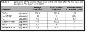 تتم مقارنة بعض العناصر المحددة بمياه الصرف المنزلية النموذجية في الجدول أدناه مع مياه الصرف في الفندق التجريبي لما تحتويه من مواد صلبة عالية للغاية ؛ الناتجة عن تصريف المواد الغذائية المطحونة في المجاري وتسبب(COD:N:P-ratio) (170:5:2).. كما لوحظت تركيزات عالية نسبية من الفوسفور ، تم نقلها بواسطة مياه الصرف الصحي للغسيل. كانت بقية العناصر قابلة للمقارنة مع مياه الصرف الصحي المنزلية النموذجية.
