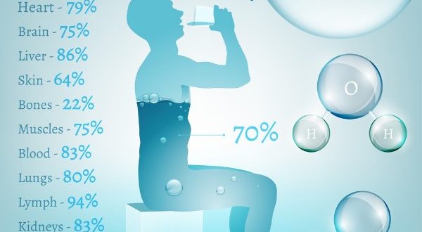 والكثير من العلماء أشاروا أن فقدان 5 إلى 10٪ فقط من ماء جسم الإنسان يؤدي إلى جفاف خطير قد يفضي للوفاة خاصة عندما ترتفع نسبة الفقد إلى 15-20٪، إحصائيا يشكل الماء 90% من مخ الإنسان و 70% من مكونات القلب و 86% من الرئتين والكبد، 83% من الكليتين، 75% من عضلات الجسم المختلفة و 83% من الدم. ويكون الماء حوالي 60-95% من أجسام الأحياء الراقية بما فيها الإنسان، كما يكون حوالي 90% من أجسام الكائنات الحية الدقيقة.