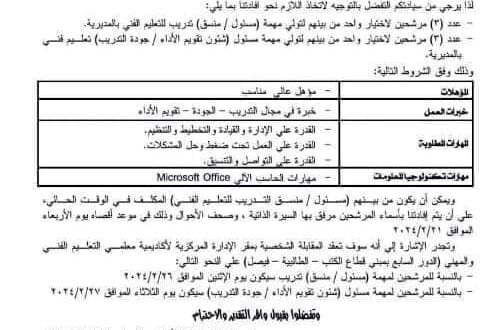 – ترشيح 3 مرشحين لاختيار واحد من بينهم لتولي مهمة (مسئول أو منسق تدريب للتعليم الفني بالمديرية.